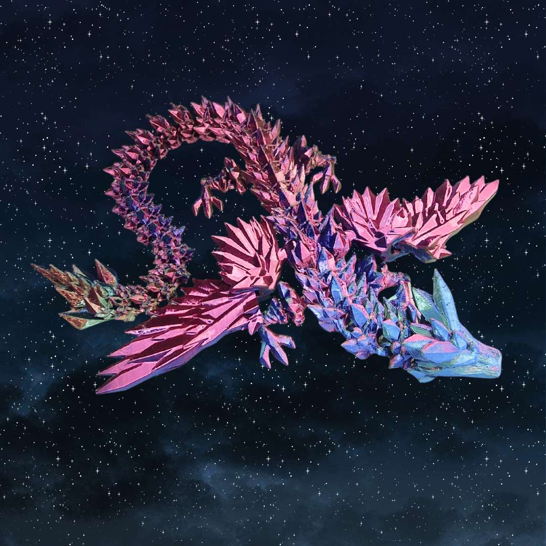 Denne detaljerede og bevægelige drage med vinger er både en fryd for øjet og for hænderne. Dragen er 3D-printet i iriserende farver, som skifter karakter, når lyset rammer den – og dens mange led og bløde bevægelser gør den til en helt særlig sansestimulerende fidget. Vingerne kan bevæge sig, og kroppen slynger sig, når du holder den i hånden.