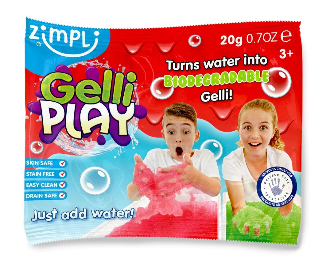 Dryss Gelli Play pulveret i en skål med vand, og se det magisk forvandle sig til farverig gele!