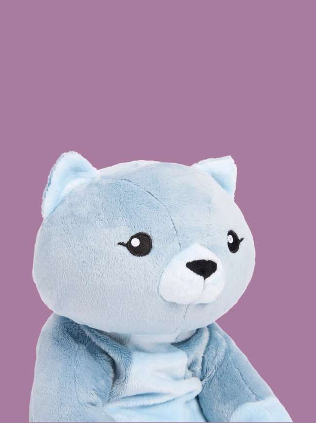 Tyngdeposen inde i bamsen kan tages ud, så betrækket kan vaskes ved 30 grader. betrækket hænges til tørre og må ikke tørretumbles.