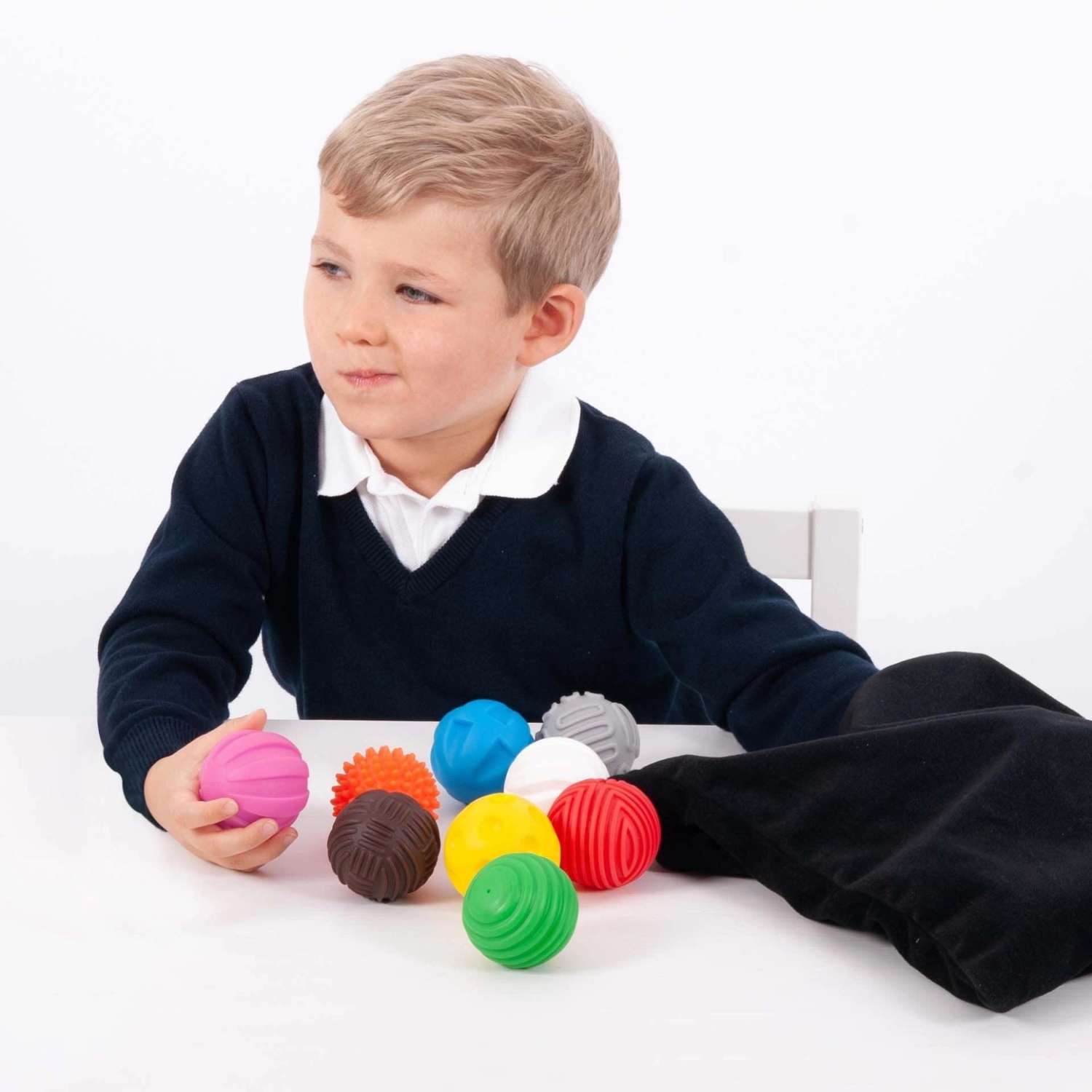 Sættet indeholder 9 par farverige bolde med forskellig overfladestruktur. De taktile variationer gør det oplagt til målrettede sanseaktiviteter, men også til fri leg, hvor barnet kan udforske i eget tempo og på egne præmisser.